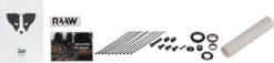 Das RAAW Mountain Bikes Jibb Rahmenkit für 29″ bildet hier ein Traum-Trio mit einem TTX 2 Air Luftfederdämpfer und einer RXF36 m.2 Federgabel von ÖHLINS. Damit erhältst Du die Hauptbestandteile für ein spielerisches Bike auf All-Mountain- und Enduro-Trails. Bei der Federgabel mit 36 mm Standrohrdurchmesser stellst Du High- und Low-Speed-Druckstufe ein, Unebenheiten schluckt sie einfach weg. Auch der TTX 2 Air Dämpfer ermöglicht die Einstellung von High- und Low-Speed-Druckstufe, zudem punktet er mit sensiblem Ansprechverhalten und hervorragender Kontrolle. Wie schon beim Madonna V2.2 setzen RAAW auch beim Jibb jetzt auf ein eigenes Steckachssystem, welches die Steifigkeit erhöht und das Lockern der Achse während der Fahrt verhindert. Das Rahmendesign unterstützt einen aktiven Fahrstil und verleiht Dir Selbstvertrauen und Kontrolle. Die ausgewogene Geometrie ermöglicht eine zentrale Sitzposition und sorgt für ausreichend Traktion. Beim Jibb ist dieselbe Detailverliebtheit erkennbar wie beim Geschwisterbike Madonna. So ist beispielsweise auch beim Jibb die Bremsaufnahme ein eigenes Bauteil. Für verschiedene Bremsscheibengrößen benötigst Du also keine zusätzlichen Adapter und die präzise Ausrichtung des Bremssattels ist kein Problem. An zwei Schraubgewinden am Oberrohr kannst Du eine Zubehörtasche (nicht im Lieferumfang) für Werkzeug und Ausrüstung befestigen, so hast Du das Wichtigste immer dabei. Die Dämpferhardware wird bereits mitgeliefert, sodass Du keine Einbaubuchsen benötigst. Mit Steckachse, Acros Steuersatz, Sattelklemme und Schutzfolien-Kit hast Du bereits die Basics für Deinen Aufbau parat.
