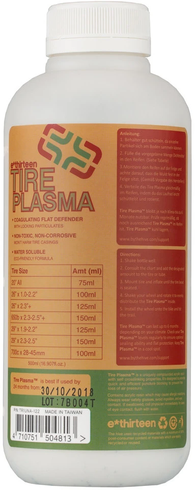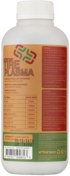 Das Tire Plasma von e*thirteen hat eine einzigartige Zusammensetzung mit sich selbst vernetzenden Plättchen auf Acrylharz Basis. Es ist so konzipiert, dass Risse und Löcher bis zu einer Größe von vier Millimetern schnell und effizient abgedichtet werden. Ein Druckverlust in Deinem Reifen wird so möglichst gering gehalten und Du kannst direkt weiterfahren. Durch die spezielle Zusammensetzung werden weder die Seitenwände Deiner Reifen noch die Umwelt angegriffen. Unter bestimmten Umständen kann es auf Grund der sich selbst vernetzenden Eigenschaften zu einer erhöhten Ausflockung der Dichtmilch kommen, daher wird von e*thirteen empfohlen das Dichtmittel direkt in den Reifen einzufüllen. Das Tire Plasma ist frei von Ammoniak.