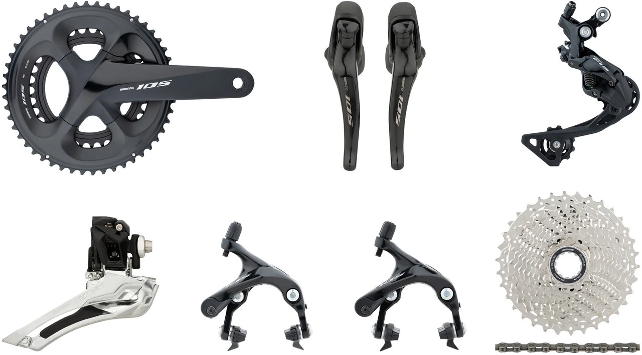 1 x Kurbelgarnitur Shimano 105 (FC-R7000)1 x Schaltwerk Shimano 105 (RD-R7000)1 x Umwerfer Shimano 105 (FD-R7000)1 Paar Schalt-/Bremsgriffe Shimano 105 STI 2-/11-fach (ST-R7000)1 Paar Felgenbremsen Shimano 105 (BR-R7000)1 x Kassette Shimano 105 (CS-R7000) oder CS-HG700-11 (11-34)1 x Kette Shimano 105 / SLX Quick-Link (CN-HG601-11)1 x Kurbelschraube Shimano1 x Außenhülle Shimano OT-RS900 240 mm1 x Endkappe verlängert für Schaltwerk1 x Schaltzug Shimano 1800 mm1 x Schaltzug Shimano 2100 mm2 x Bremszug2 x Bremszugaußenhülle3 x Schaltzugaußenhülle6 x Montage-Gelenkmutter für Felgenbremse2 Paar Bremsbeläge R55C41 x Kassetten-Abschlussring Shimano Stahl1 x Kassetten-Spacer Shimano 1,85 mm (nur bei 11-34)1 x Kettenschloss Shimano SM-CN900-11 Quick-Link