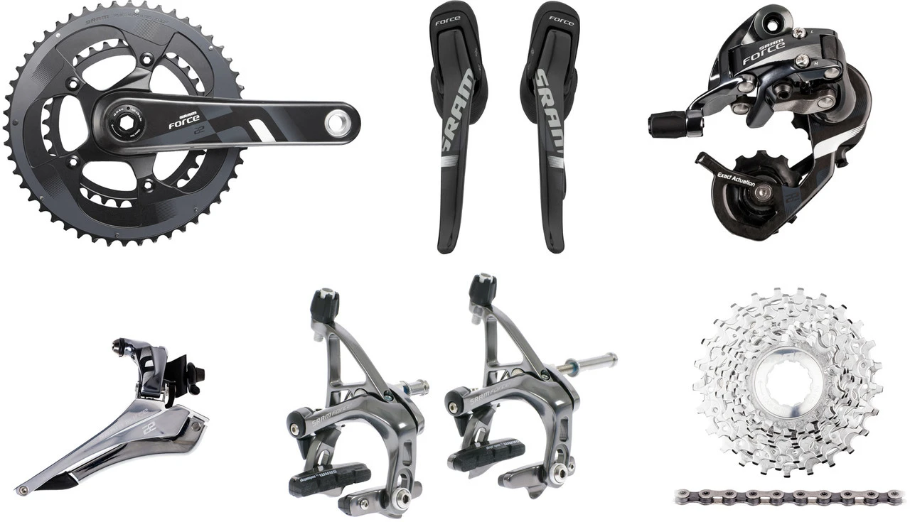 1 x Kurbelgarnitur SRAM Force 22 GXP1 x Schaltwerk SRAM Force 22, kurz oder mittel1 x Umwerfer SRAM Force 22 anlöt1 Paar Schalt-/Bremsgriffe SRAM Force 22 DoubleTap® 2-/11-fach1 Paar Felgenbremsen SRAM Force, mechanisch1 x Kassette SRAM PG-11701 x Kette SRAM PC 11702 x Schaltinnenzug2 x Bremsinnenzug2 x Bremszugaußenhülle2 x Schaltzugaußenhülleinkl. Endhülsenohne GXP-Innenlager