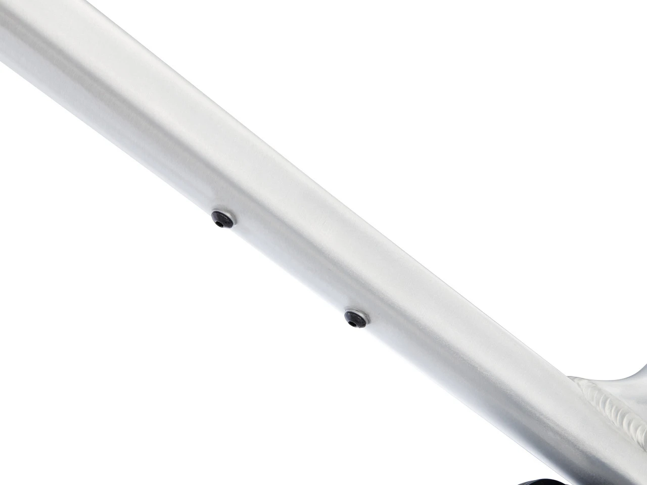 Wie üblich bei RAAW zeugen durchdachte Elemente von hoher Detailverliebtheit. Das Rahmendesign zeigt Matsch die kalte Schulter und ist leicht zu reinigen. Komplett außenverlegte Züge vereinfachen die Wartung und erlauben schnelle Reparaturen. Schützende Gummielemente an Unterrohr und Kettenstrebe sowie innen an der rechten Sitzstrebe tun ihren Job ebenso wie die extralangen Anschlagpuffer, welche verschiedene Gabel-Offsets erlauben und zugleich als Kabelführung dienen. Die zwei Gewinde unten am Oberrohr verwendest Du bei Bedarf, um eine kleine Werkzeugtasche anzubringen. Die Scheibenbremsaufnahme ist ein eigenes Bauteil und standardmäßig für 203-mm-Bremsscheiben ausgelegt. Der spezielle Steuersatz und Hardware zur Dämpfermontage sind bereits im Lieferumfang enthalten.